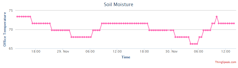 The response is a chart that displays the soil moisture measurement with a pink line and a custom title and a wide view. The data is from a soil moisture monitor posting to ThingSpeak Channel 276330.
