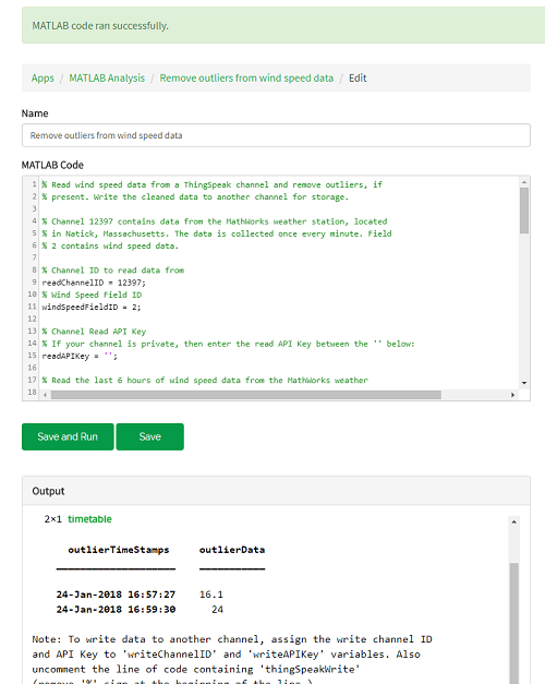 4) Execute your code by clicking Save and Run. The chart in your ThingSpeak channel is populated with time series data for wind speed without the calculated outliers. You can access your channel by clicking the channel link in the Channel Info panel on the right side of the page.