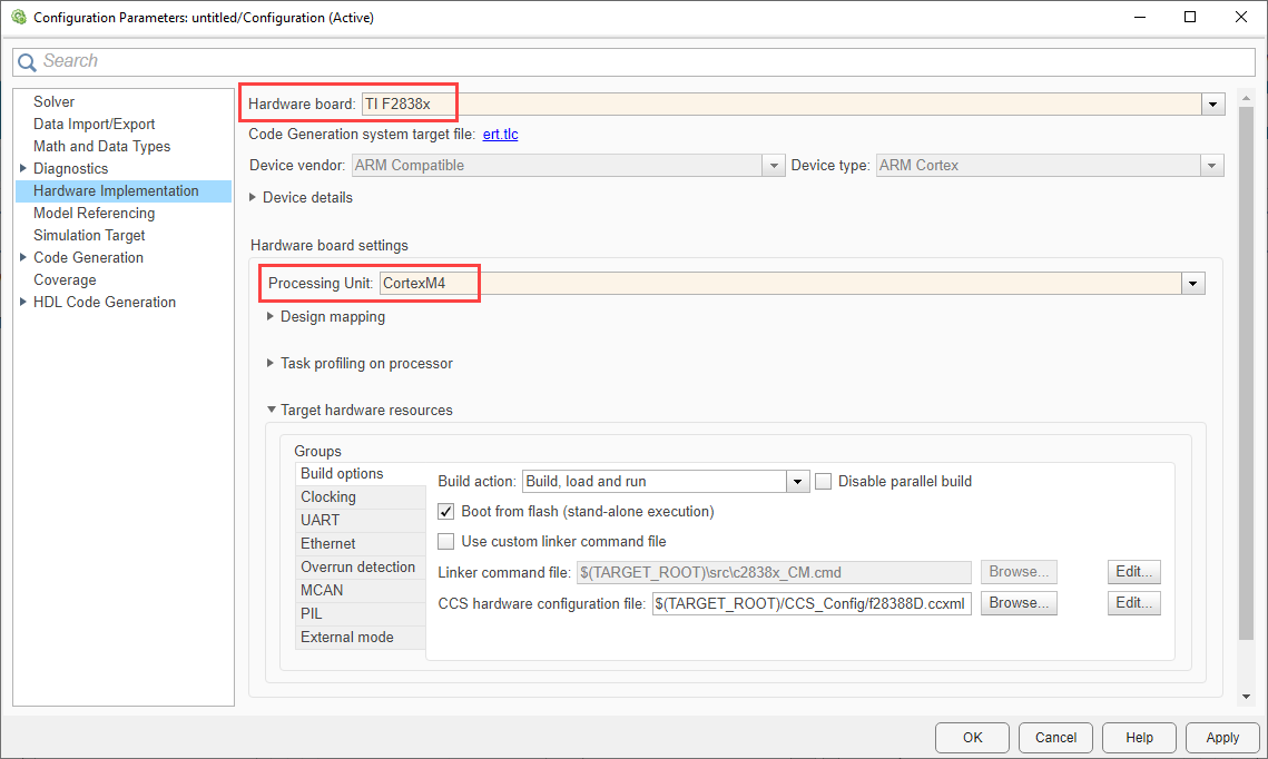 Model Configuration Parameters for Texas Instruments F2838x (ARM Cortex-M4)