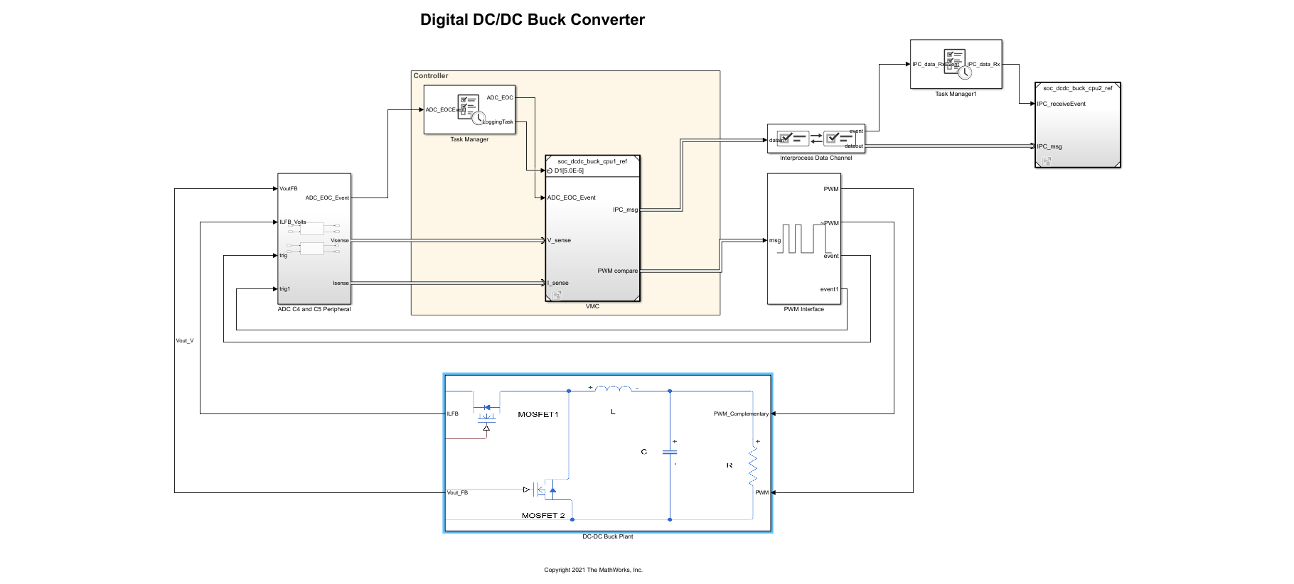 This example shows how to develop a DC-DC buck converter power regulator application. Typical challenges with power conversion simulation and deployment include: