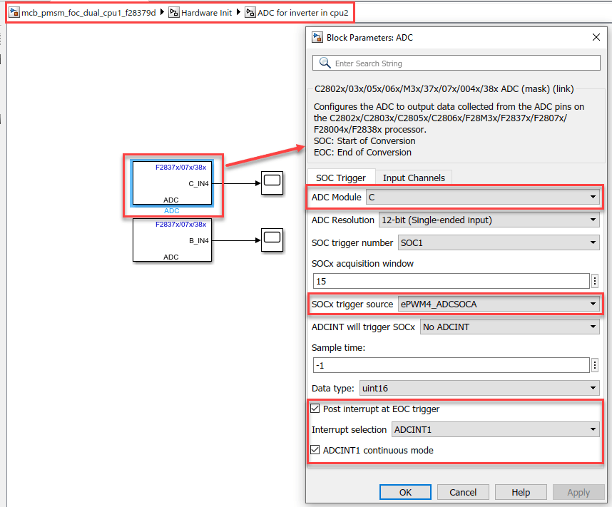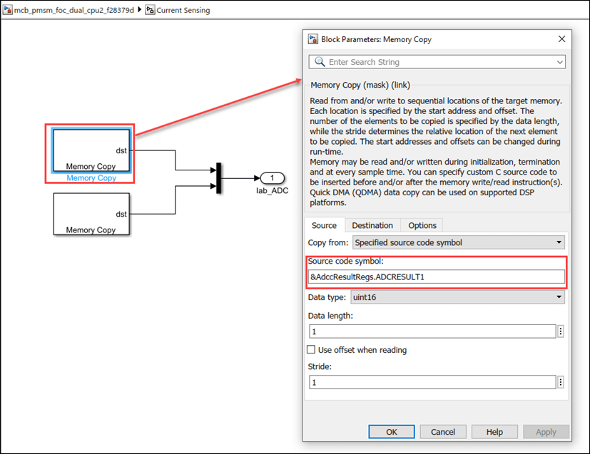 For Dual CPU model, the ADC channels for inverter 2 is defined in the initialize function of the CPU1 model. In CPU2 model, we use Memory Copy blocks, to access the value of the ADC registers.