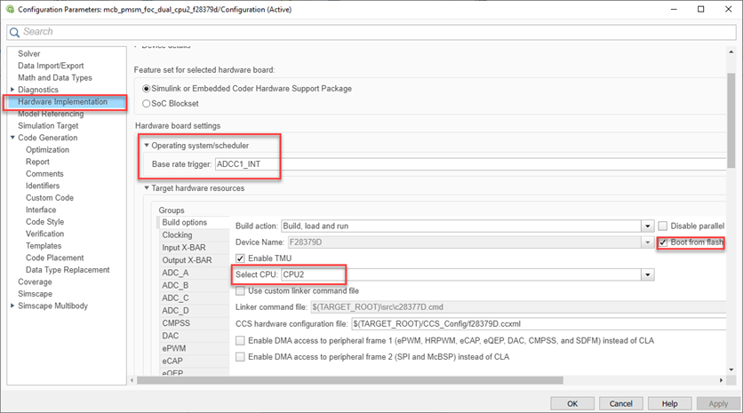 2. To run the model on other TI C2000™ processors, first press Ctrl+E to open the Configuration Parameters dialog box. Then, select the required hardware board by navigating to Hardware Implementation > Hardware board.