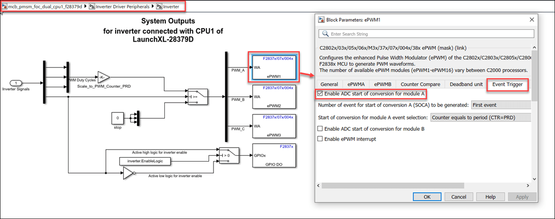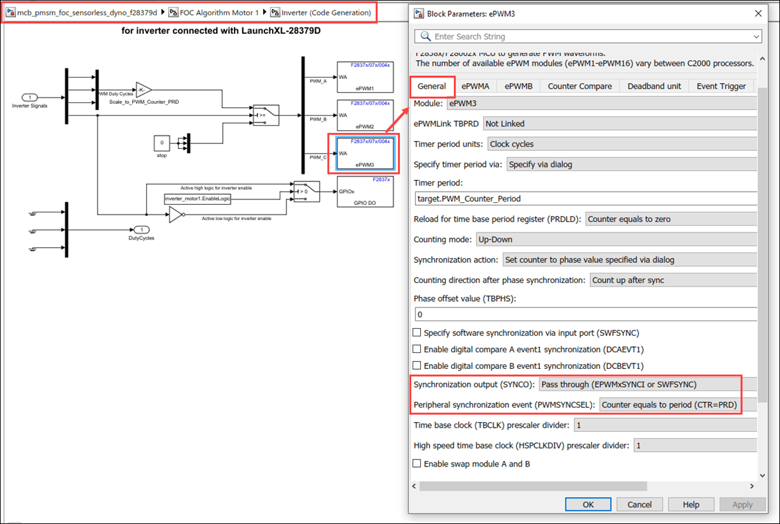 You can use mcb_pmsm_foc_sensorless_dyno_f28379d and mcb_pmsm_foc_qep_dyno_f28069m models for both simulation and code generation. You can also use the open_system command to open the Simulink® model. These models use timer0 as a base rate trigger. For example, use this command for a F28379D based controller: