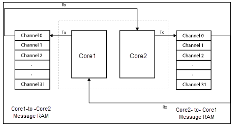 Core1 transmits data to its allocated memory (Core1-to-Core2 Message RAM) and receives data from the allocated memory of Core2 (Core2-to-Core1 Message RAM). Similarly, Core2 transmits data to its allocated memory (Core2-to-Core1 Message RAM) and receives data from allocated memory of Core1 (Core1-to-Core2 Message RAM). For more information, refer Inter-Processor Communication Using IPC Blocks.