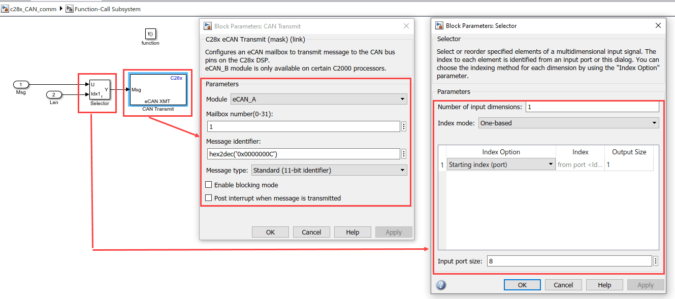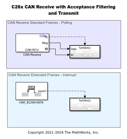 This example shows how to use the CAN blocks to set up CAN communication between the target hardware and your host computer for Texas Instruments™ C2000™ Microcontroller Blockset.