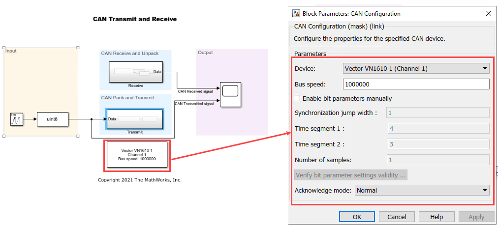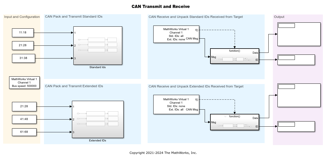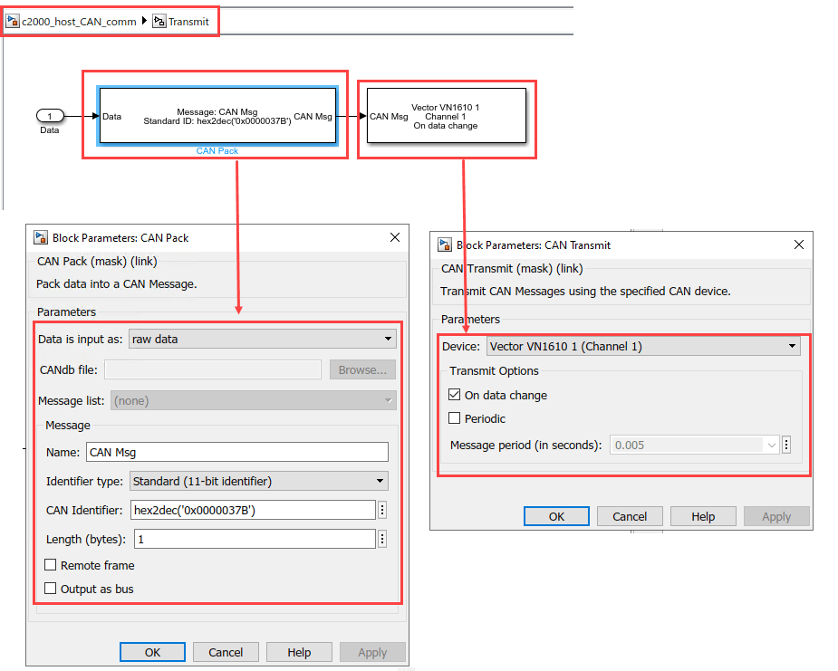 CAN Configuration, CAN Transmit and CAN Receive blocks on the host are from the Vehicle Network Toolbox™ library.