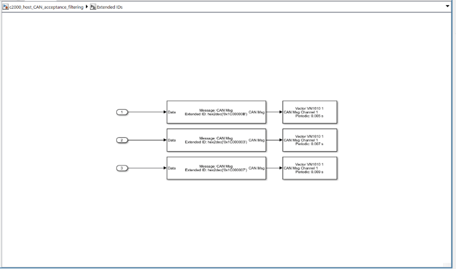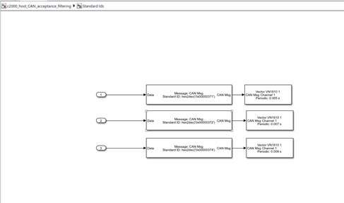 6. The host model has two Receive blocks, one receives all the standard messages and the other receives all the extended messages at the rate of sample time 0.001s.