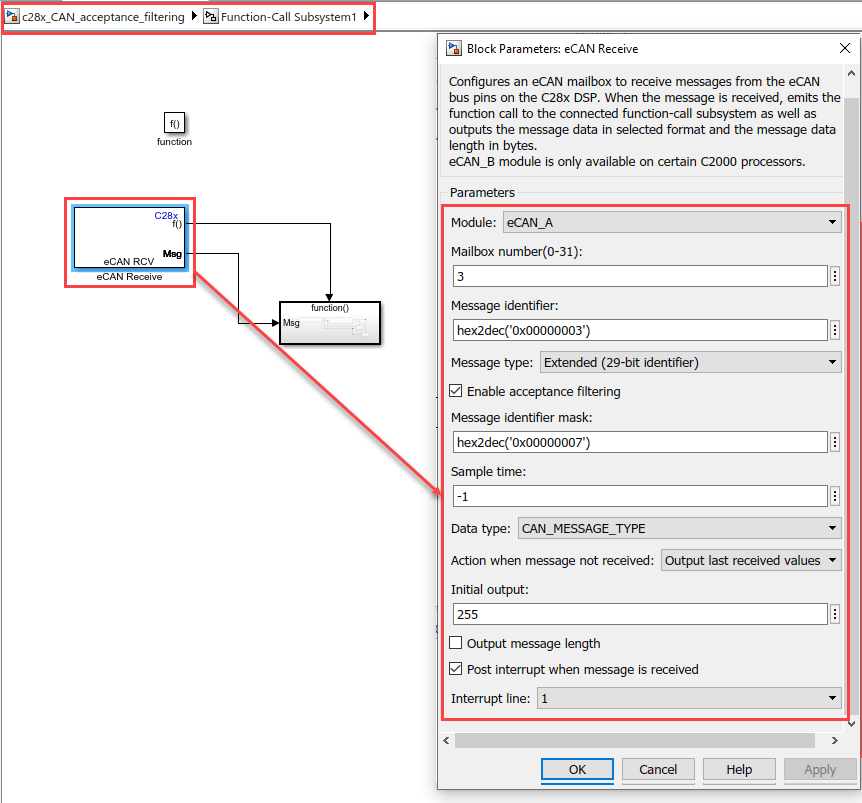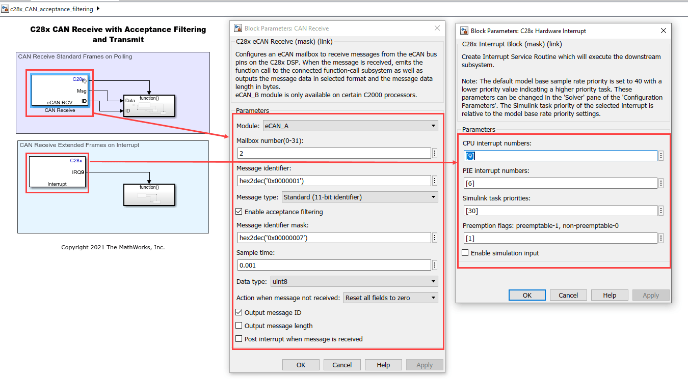 1. Open the target c28x_CAN_acceptance_filtering.slx model.