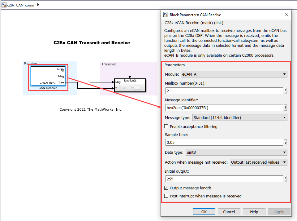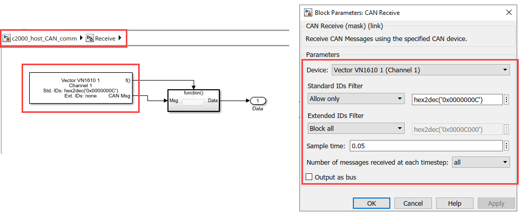 hex2dec('0x00000002') or hex2dec('0x00000004'), to receive messages with standard IDs of hex2dec('0x00000372') or hex2dec('0x00000374'), respectively, on the target hardware.In the CAN Receive block, which is configured to receive extended messages, change the Message identifier mask parameter to