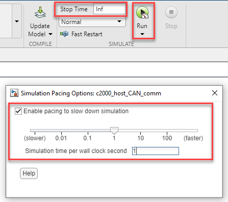 3. Set the Stop time to Inf and click on Run drop-down and enable the Simulation Pacing in order to ensure real time communication with target.