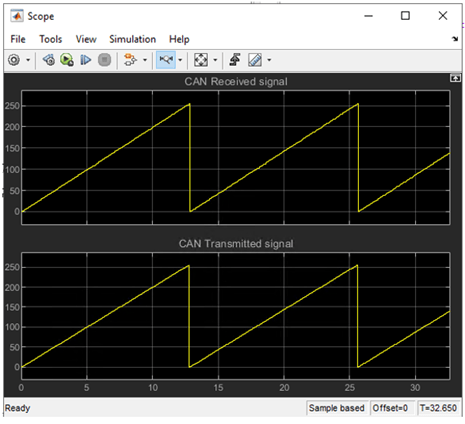 4. The model is configured to receive the data at sample time of 0.05s and to transmit the same data with a different message ID once it receives the message.
