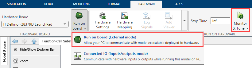 1. On the Hardware tab, in the Mode section, select Run on board (External Mode) and then click Monitor & Tune.