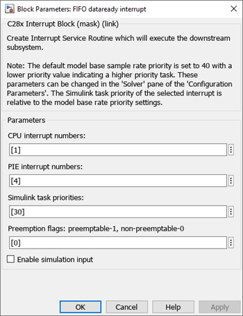 1. In the model, open the External Interrupt block, and specify the values for CPU interrupt numbers, PIE interrupt numbers, and Simulink task priorities, and Preemption flags. For more information on working with External Interrupts, see External Interrupt Workflow for Texas Instruments C2000 Processors.