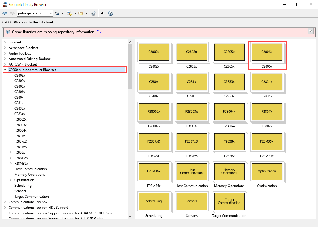 2. In the Simulink Library Browser, navigate to Libraries > C2000™ Microcontroller Blockset and select C2806x processor.