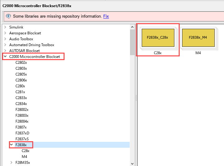 2. In the Simulink Library Browser, navigate to Libraries > C2000™ Microcontroller Blockset > F2838x > Select F2838x_C28x processor.