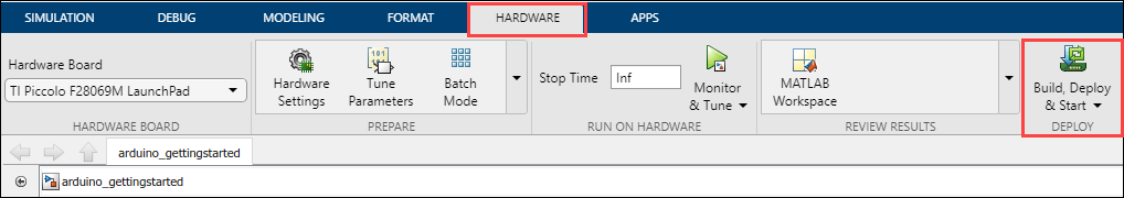 6. Go to the Hardware tab and click Build, Deploy & Start to generate code for the model and deploy the executable.