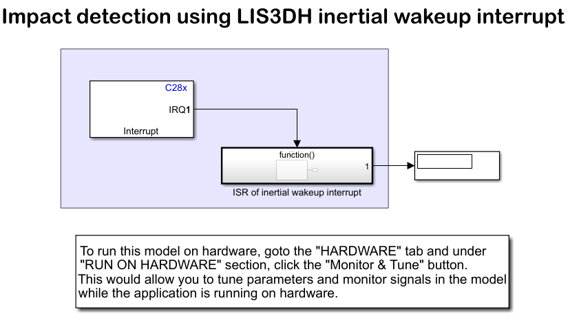 Open the c28x_i2c_lis3dh_inertialwakeupinterrupt Simulink model.