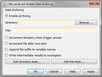 3. Click on the Data Archiving button of the External Mode Control Panel to enable logging data to a MAT file from the Enable Data Archiving dialog box.