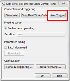 You can use the Arm trigger button on the External Mode Control Panel to trigger data logging. The Arm when connecting to target option enables the trigger automatically when the host connects to the target and data uploading begins. Otherwise, to start uploading the data, you must manually arm the trigger by clicking the Arm trigger button located in the External Mode Control Panel. Triggers can be useful when the communication channel speed does not allow live visualization of the desired signals. In this task, you will learn how to manually trigger data uploading from the target to the host computer.