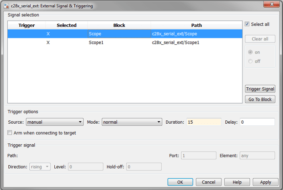 b. Specify the Duration as 15 to collect 15 data samples for a base rate signal. Since the signal from the Gain block has the same sample rate as that of the model, the number of samples collected in each data set is 15. Uncheck the Arm when connecting to target option to enable manual triggering to upload data.