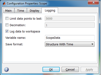 5. Open the Scope connected to the Gain block and click on the Configuration Properties button. Navigate to the Logging tab and check the Log data to workspace option. Specify a name in Variable name. The logged data is saved in this variable. To save the time instant and the signal data values, select Structure With Time for Save format.