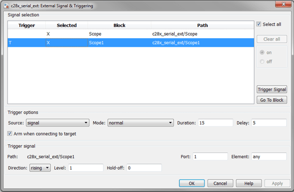 2. In this dialog box, select the Scope block connected to the Step input and click the Trigger Signal button to set the selected block signal as the trigger signal.