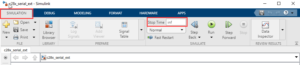 5. Open the Simulation tab and specify a value in the Stop Time text box. You can specify the stop time as 'inf' to run the model continuously on the target hardware.