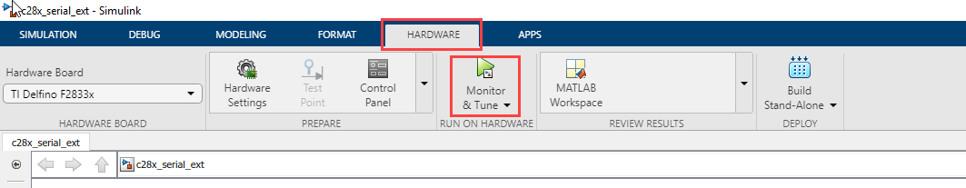 When you perform Monitor and Tune action for the model, the host computer communicates with the target, on which the generated executable runs. To perform Monitor and Tune in the c28x_serial_ext: