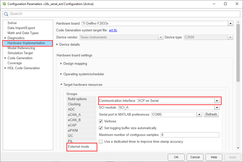 Note: To run the c28x_serial_ext on targets with small amounts of RAM such as the F28027 or F28035, enable the Boot From Flash (stand alone execution) option in Hardware Implementation > Target Hardware Resources > Build options tab and increase the heap size as mentioned in the Limitations section.