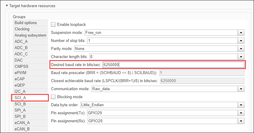 Set the peripheral block configurations for this model. Double-click on the blocks to open block parameter configurations. You can use the same parameter values if you want to run this example for other hardware boards.