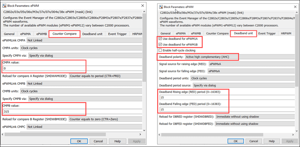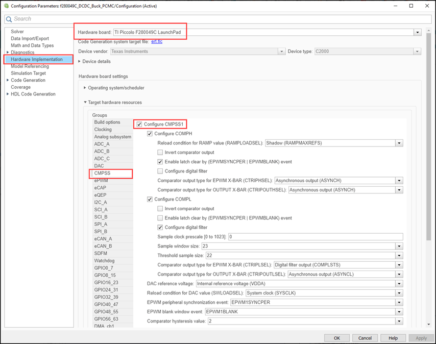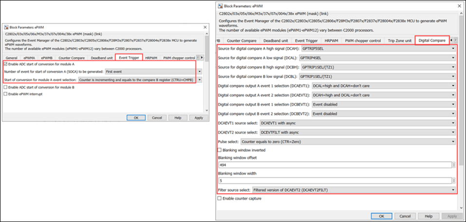 3. The following screenshots show the CMPSS configurations performed in the model. You can use the same parameter values if you want to run this example for other hardware boards.