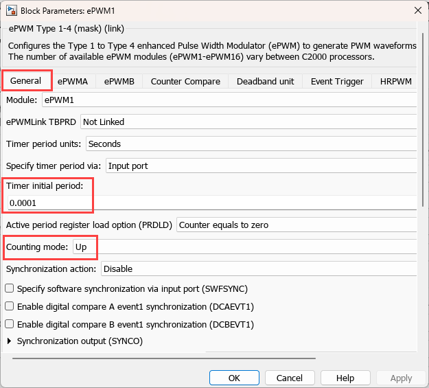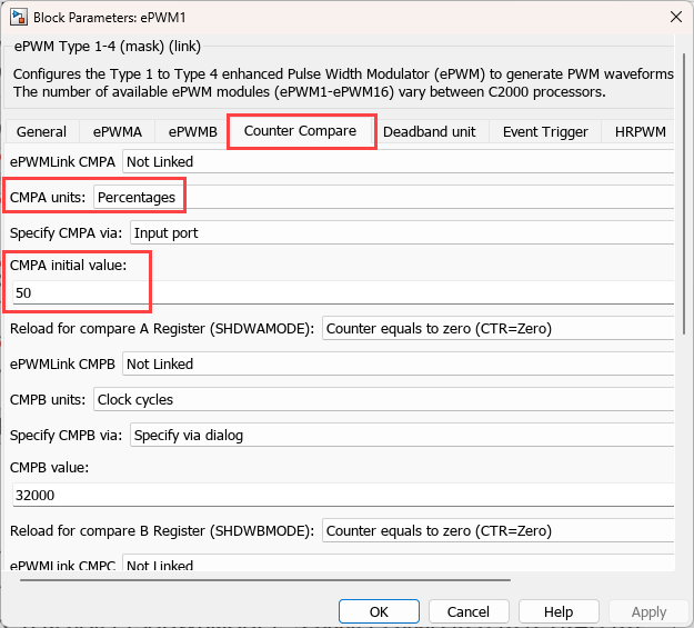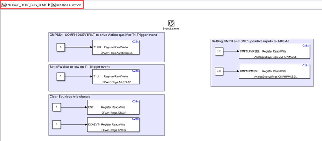 In order to switch ePWM based on comparator output the following configurations are made in the Initialize subsystem in the model.
