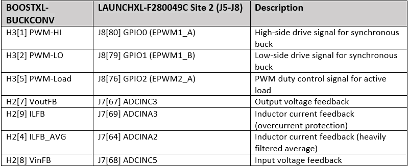 Connect the Digital Power Buck Converter BoosterPack (BOOSTXL-BUCKCONV) to the Texas Instruments Piccolo F280049C LaunchPad as detailed in the following table. For more information, refer C2000 Digital Power Booster Pack