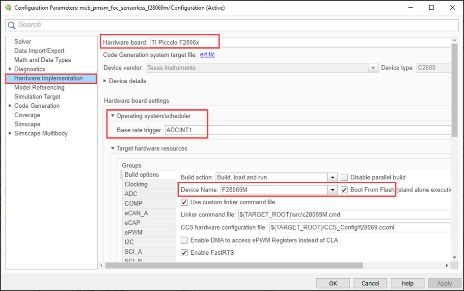2. To run the model on other TI C2000 processors, first press Ctrl+E to open the Configuration Parameters dialog box. Then, select the required hardware board by navigating to Hardware Implementation > Hardware board.
