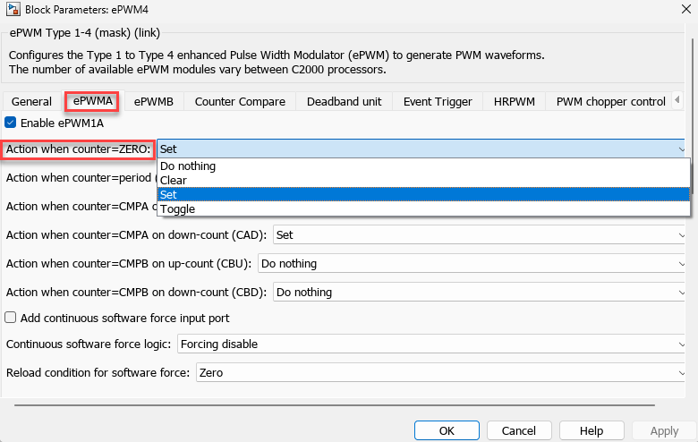 When the counter value is zero, configure the parameter in the ePWM Type 1-4 block as shown here.