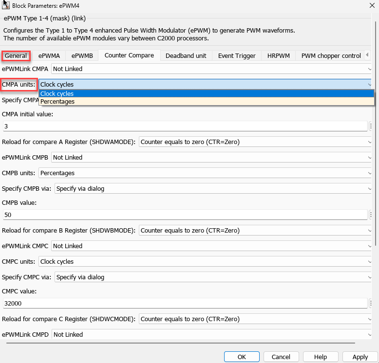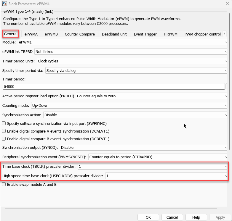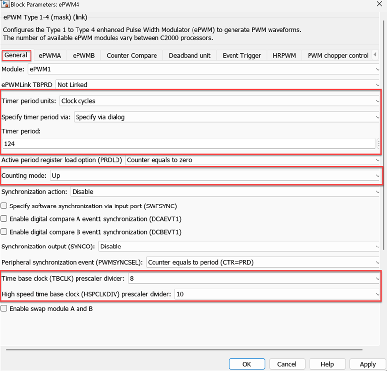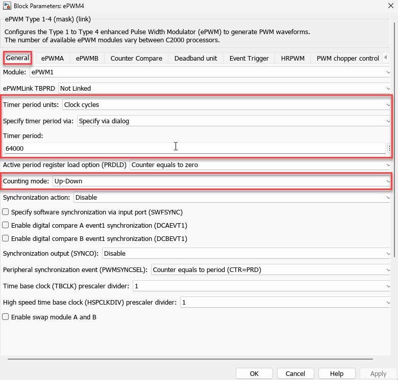 Clock cyclesorseconds.You can configure the timer period and counting mode parameters in the ePWM Type 1-4 block as shown here.