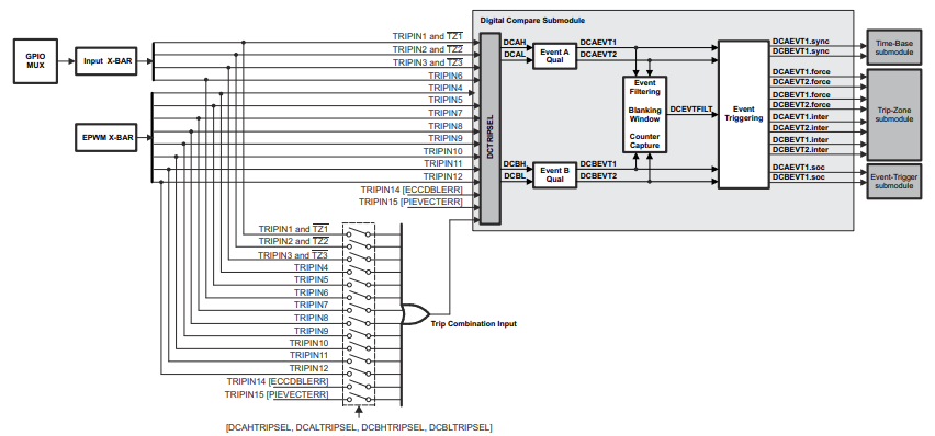 In the digital compare submodule, the input signals TZ1 to TZ3 and TRIP6 come from the Input X-BAR via GPIO pins. TRIP14 and TRIP15 are internally generated input signals. TRIP4, TRIP5 and TRIP7 to TRIP12 are input signals that come from EPWM X-BAR. Select a combination of these signals to generate the Digital Compare A High and Low (DCAH/L) and Digital Compare B High and Low (DCBH/L) signals.