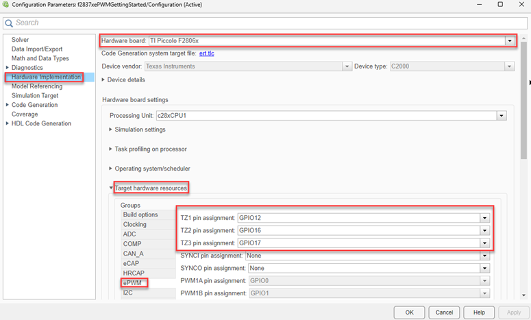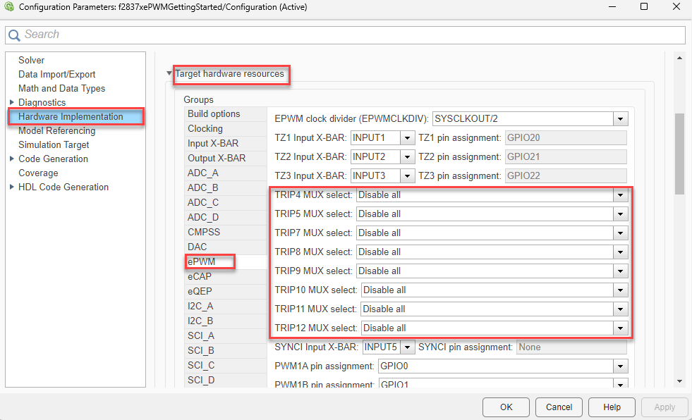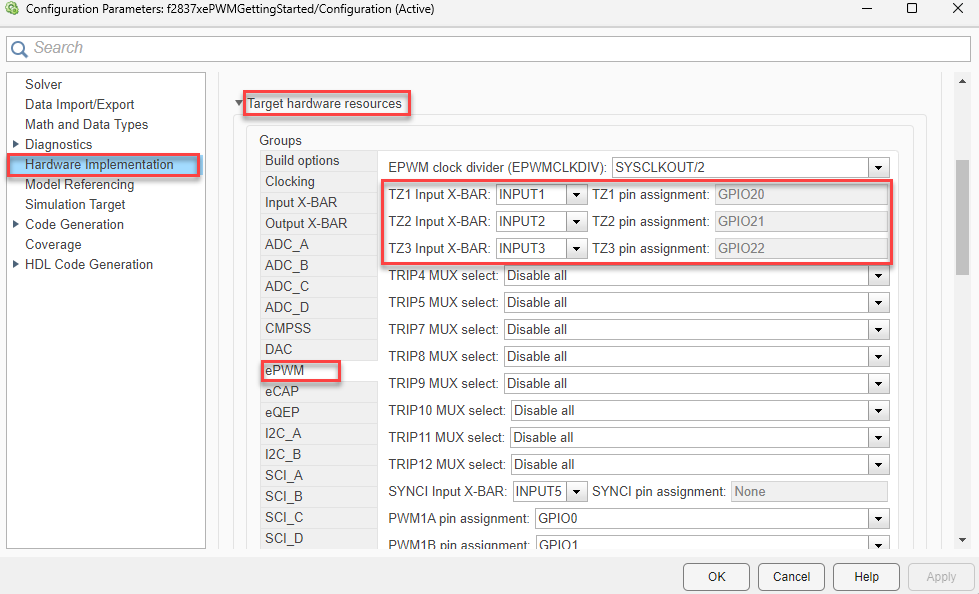 Navigate to Hardware Implementation > Target hardware resources > ePWM to visualize the pin assignment as shown here.