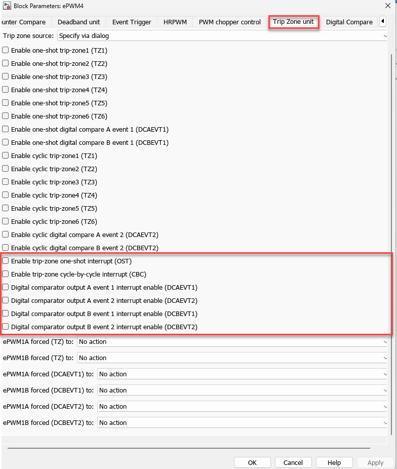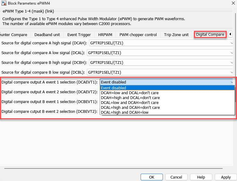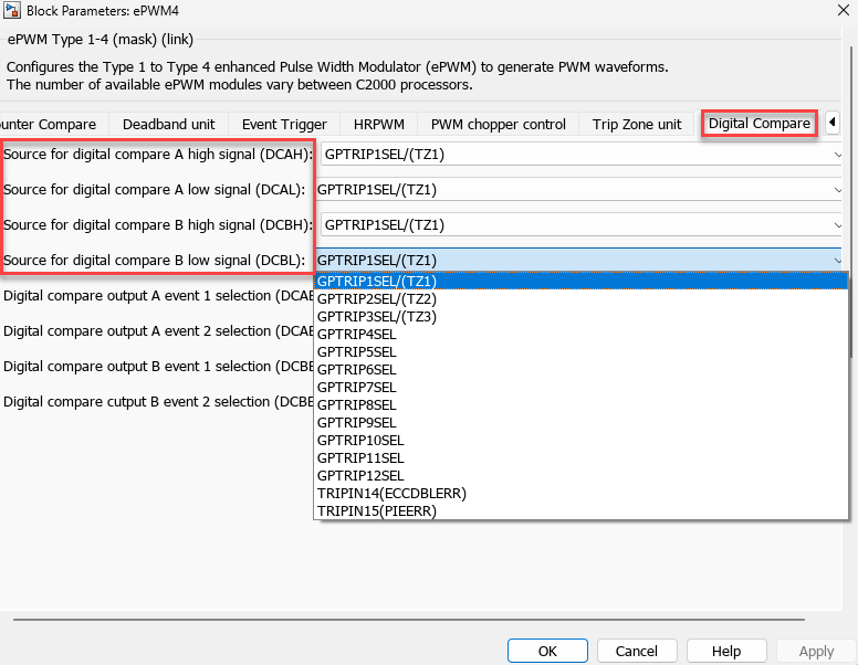 Configure the signals that come as Digital Compare A High/Low (DCAH/L) and Digital Compare B High/Low (DCBH/L) using the block parameters in the ePWM Type 1-4 block as shown here.