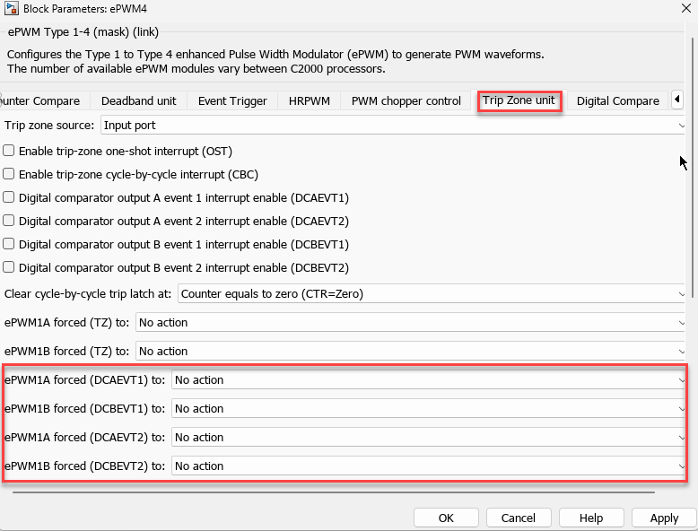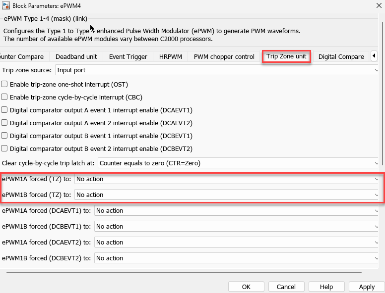 Configure the action qualifiers for the digital compare events DCAEVT1/2 and DCBEVT1/2 using the block parameters in the ePWM Type 1-4 block as shown here.