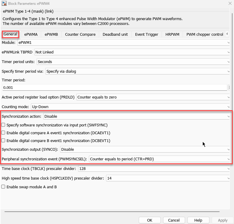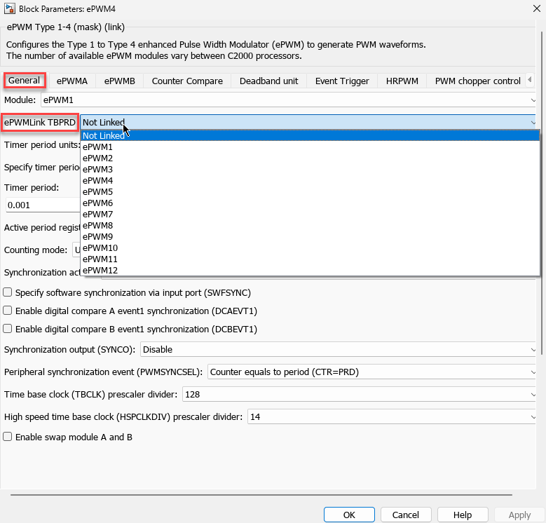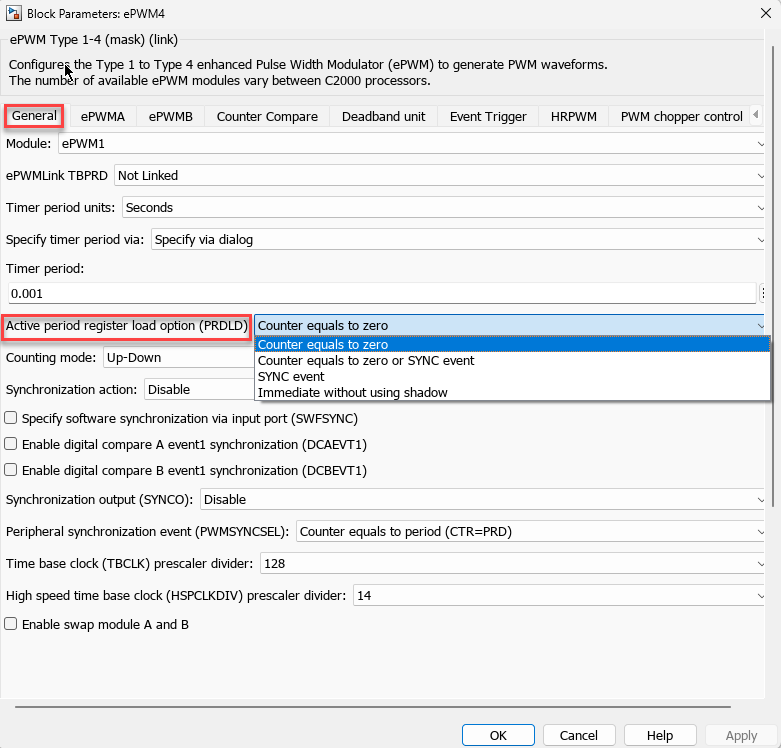 You can configure the parameters of the ePWM Type 1-4 block based on the calculation as shown here.