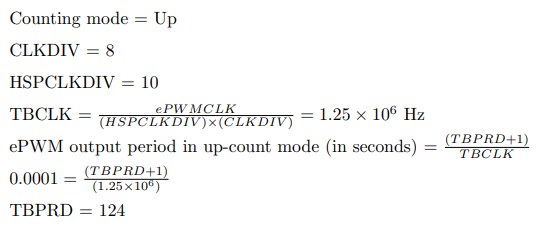 For example, in an F2837xD processor running at a frequency of 200 MHz, to achieve an ePWM output frequency of 10 kHz, the calculation is shown here.