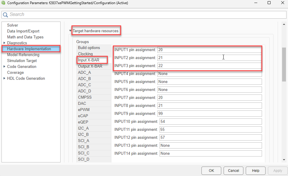 Navigate to Hardware Implementation > Target hardware resources > Input X-BAR to configure the GPIO pins for these signals as shown here.