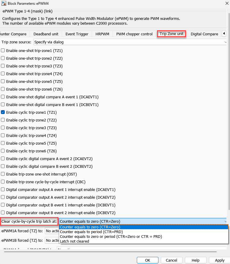 You can generate interrupts on any trip-zone input. Configure the trip zone using the parameters in ePWM Type 1-4 block as shown here.