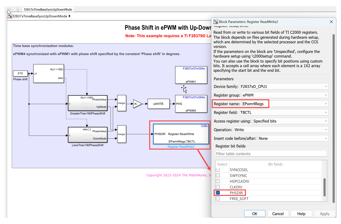 In the model, this is achieved by using the Register Read/write block, where we change the corresponding register field PHSDIR of EPwm4Regs which controls the direction of ePWM counter after synchronization.