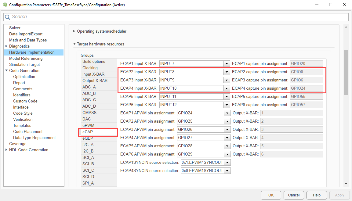The PWM signals (ePWM1 at GPIO0, ePWM4 at GPIO6 and eCAP1 at GPIO24) are given as input to eCAP through Input X-BAR under Hardware Implementation > Target hardware resources > Input X-BAR.