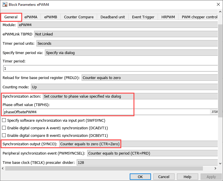 ePWM4 is configured to have synchronization input from ePWM1 SYNCOUT in the Configuration Parameters.