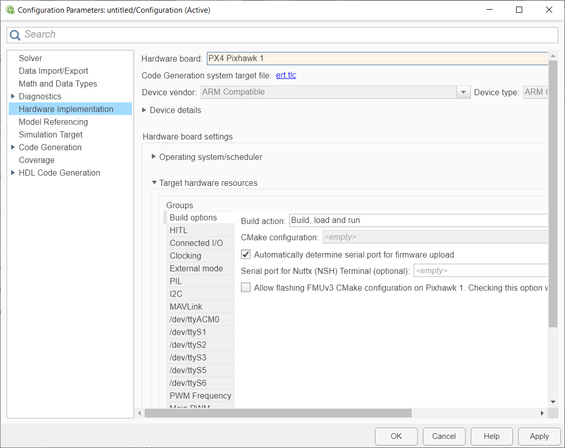 In the Target Hardware Resources section, enter the serial port of the host computer to which the Pixhawk Series controller is connected, in the Serial port for firmware upload field.
