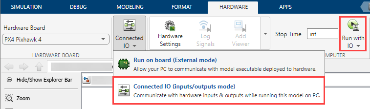 Connected IO: To run this model in the Connected I/O mode, on the Hardware tab, in the Mode section, select Connected IO and then click Run with IO.