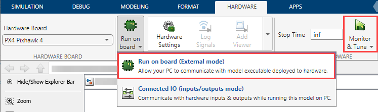 Monitor & Tune: To run the model for signal monitoring and parameter tuning, on the Hardware tab, in the Mode section, select Run on board and then click Monitor & Tune to start signal monitoring and parameter tuning.